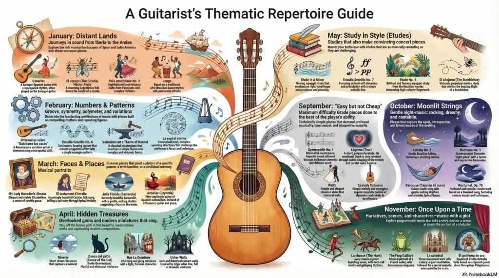 This theme is dedicated to the joy of discovery. “Hidden Treasures” encourages students to broaden their musical horizons by exploring compelling works beyond the standard teaching canon. The focus is on overlooked historical gems and engaging miniatures by contemporary composers. This exploration not only expands a student’s repertoire but also fosters curiosity, independence, and a deeper appreciation for the vast and varied landscape of classical guitar music.